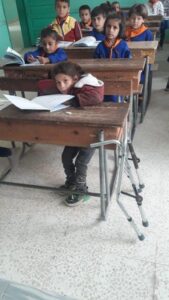 لكننا نرى في الصورة خطأ يجب تلافيه على الفور وهي أنها تعاني من صغر حجمها وإعاقتها مع مقعدها الخشبي الكبير فتضطر لتلقي دروسها بوضعية غير مريحة، أين مديرية التربية في الرقة من هذا الخطأ ؟ نطالب بتخصيص مقعد خاص يناسبها بشكل فوري ولكم الشكر.
