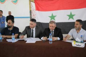 حضر الاجتماع أمين فرع دير الزور لحزب البعث العربي الاشتراكي رائد الغضبان ومحافظ دير الزور فاضل نجار