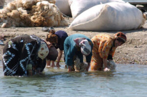 تجتمع النّسوة على شاطئ النّهر، وكلّ واحدة منهنّ تحمل أكياساً أو شوالَ صوفٍ ليبدأنَ بالغسيل إمّا فرادى أو على شكل جماعات مع نهاية موسم جرز الصوف الّذي يكون في نهاية فصل الربيع وأوائل فصل الصيف، لكون فصل الصيف في مدينة دير الزور شديد الحرارة، فينشف الصّوف بسرعة