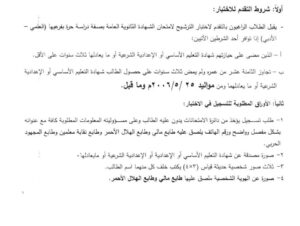 عممت وزارة التربية على مديرياتها في المحافظات تعليمات التسجيل لاختبار الترشح للتقدم لامتحان الشهادة الثانوية العامة بصفة دراسة حرة بفرعيها الأدبي والعلمي لدورة ٢٠٢٤م، حيث يبدأ التسجيل اعتباراً من يوم الأحد الواقع في ٢٢/١٠/٢٠٢٣م ولغاية يوم الخميس الواقع في ٩/١١/٢٠٢٣م، على أن يجرى الامتحان المؤتمت الساعة العاشرة من صباح يوم السبت الواقع في ٢٥/١١/٢٠٢٣م في المراكز المعتمدة من قبل مديريات التربية ولمدة ثلاث ساعات وفي جميع المواد المقررة لكل فرع.