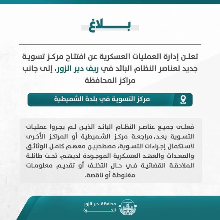 أعلنت ادارة العمليات العسكرية عن افتتاح مركز تسوية جديد لعناصر النظام البائد في بلدة الشميطية بريف دير الزور الغربي، ودعت إدارة العمليات العسكرية عناصر النظام البائد الذين لم يجروا التسوية حتى الان، المبادرة بمراجعة المراكز المفتتحة بالمحافظة، لإجراء التسوية مصطحبين معهم الوثائق والعهد العسكرية التي بحوزتهم، تحت طائلة الملاحقة القضائية في حال التخلف او تقديم معلومات مغلوطة او ناقصة