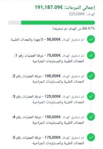 وقال الدكتور “قتيبة الحماوي” أحد المشرفين على الحملة في ألمانيا : بسبب استمرار دعمكم ورغبتكم بالمواصلة بإغاثة القطاع الصحي، استطاعت الحملة تحقيق ستة أهداف من أصل ثمانية، شمل الهدف الأول شراء معدات وأجهزة طبية، والأهداف السبعة المتبقة تجهيز 7 غرف عمليات في المشفى الوطني بشكل كامل من الألف إلى الياء، من أجهزة تخدير و تجهيزات طبية و أدوات جراحية.