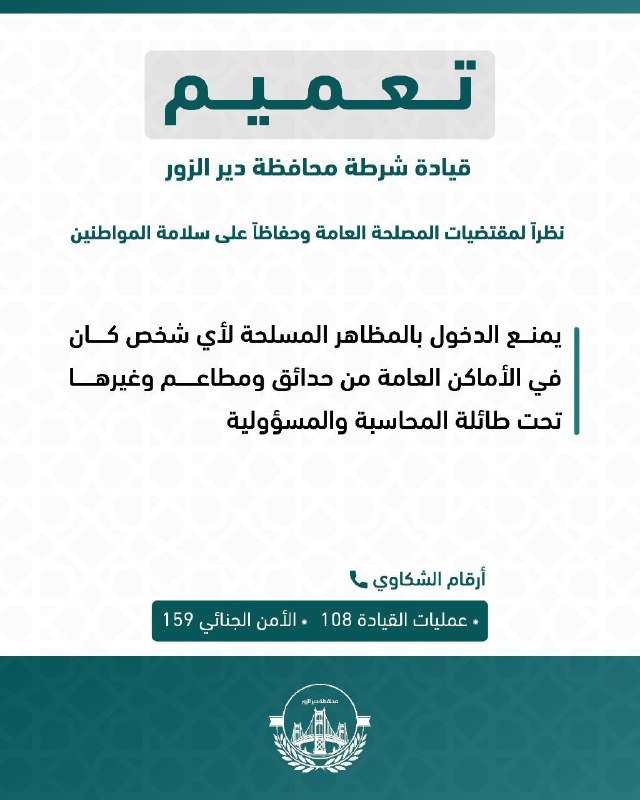 أصدرت قيادة شرطة محافظة دير الزور تعميما جاء فيه “نظراً لمقتضيات المصلحة العامة وحفاظاً على سلامة المواطنين، يمنع الدخول بالمظاهر المسلحة لأي شخص كان في الأماكن العامة من حدائق ومطاعم وغيرها تحت طائلة المحاسبة والمسؤولية.