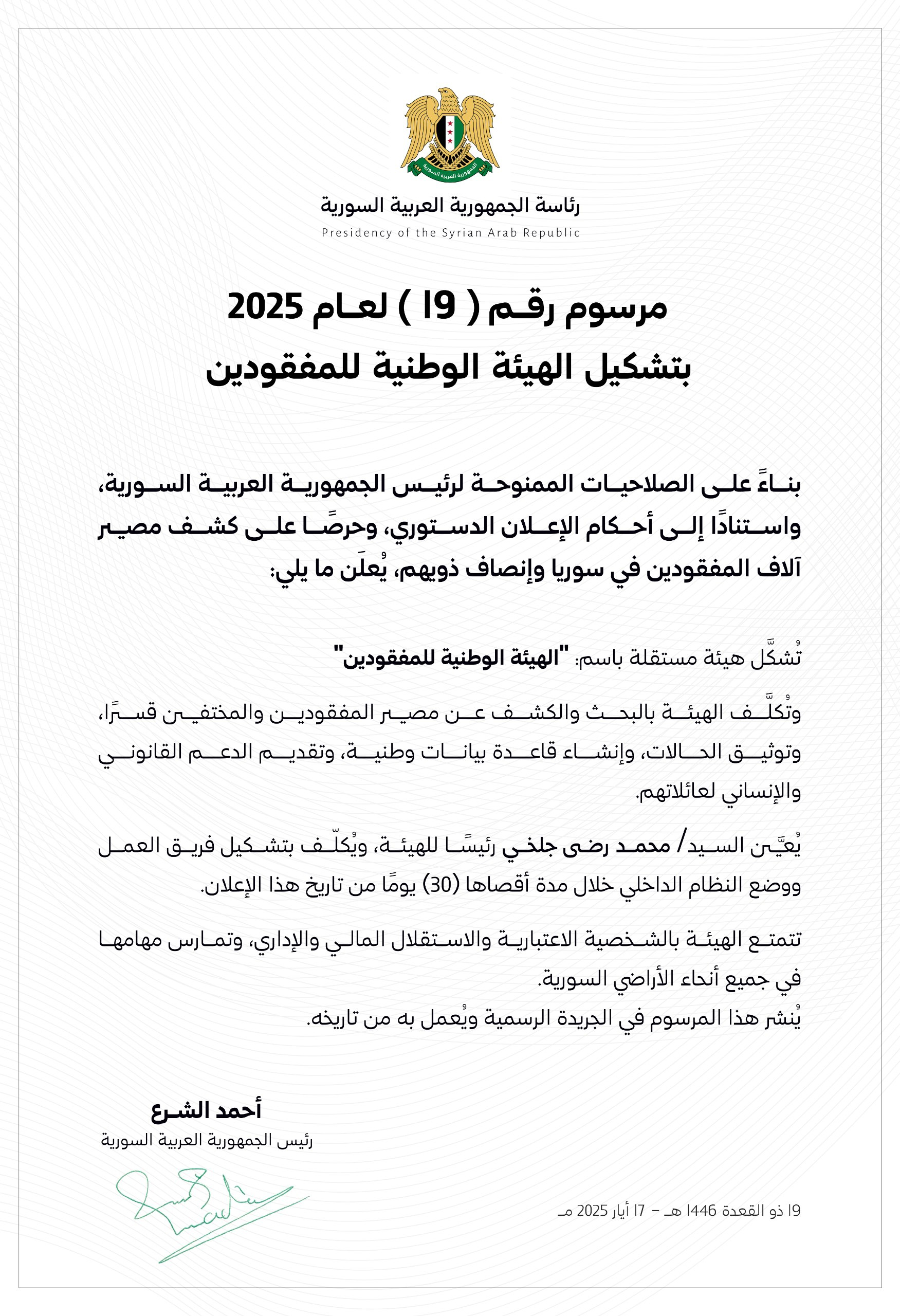رئاسة الجمهورية: مرسوم رئاسي بتشكيل الهيئة الوطنية للمفقودين رئيسيمحليات آخر تحديث 18 أيار , 2025 شارك FacebookTwitterWhatsAppTelegramFacebook Messenger رئاسة الجمهورية: مرسوم رئاسي بتشكيل الهيئة الوطنية للمفقودين