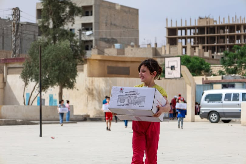 “سوف أتشارك بها مع إخوتي، حتى نلبس كلنا لباسا جديدا” بهذه الكلمات عبرت ملاك (7أعوام) عن فرحتها عند استلامها حصة اللباس التي وزعها متطوعو الهلال الأحمر العربي السوري في مدرستها “عزيز مطر سمير” في مدينة دير الزور.