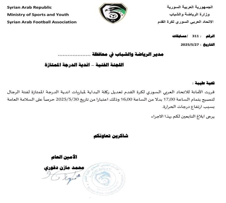 قررت الأمانة العامة للاتحاد العربي السوري لكرة القدم؛ تعديل ركلة البداية لمباريات أندية الدرجة الممتازة لفئة الرجال لتصبح بتمام الساعة ١٧:٠٠ (الساعة الخامسة)بدلاً من الساعة ١٦:٠٠ اعتباراً من تاريخ ٣٠ ايار ٢٠٢٥ وذلك حرصاً على السلامة العامة بسبب ارتفاع درجات الحرارة.