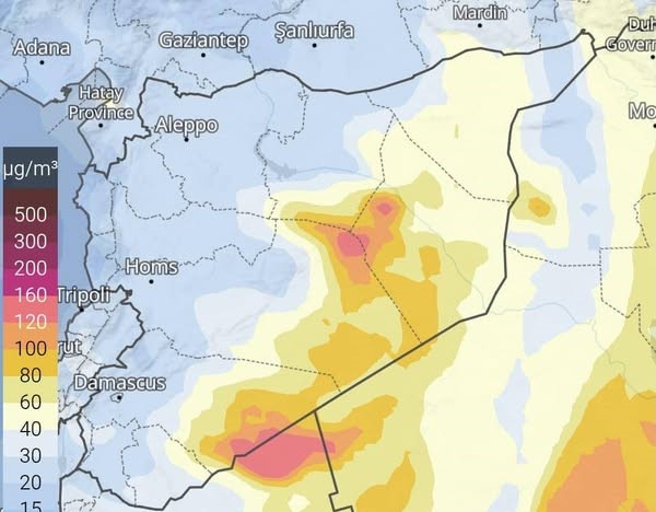 🔹تؤدي حركة الرياح النشطة والقوية لإثارة الأتربة والغبار على المناطق الشرقية والجزيرة، لتكون الأجواء سديمية ومغبرة على الأجزاء الشرقية لريف دمشق، وشرق حمص، وأجزاء من الرقة والحسكة، وعموم مناطق دير الزور، مع احتمالية تشكل عواصف غبارية كثيفة على تلك المناطق.