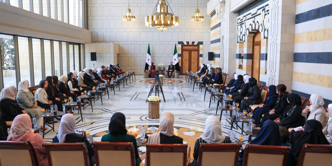 في لقاء جمع السيد الرئيس أحمد الشرع وعقليته السيدة لطيفة الدروبي بمجموعة من النساء السوريات بمناسبة عيد الأضحى المبارك، أشاد سيادته بالدور الريادي والتاريخي الذي لعبته المرأة السورية في مختلف المراحل، من فترات المحن إلى مرحلة التحرير، مؤكداً أن المرأة السورية كانت وما زالت عنصراً محورياً وشريكاً أساسياً في مسيرة العمل والبناء.