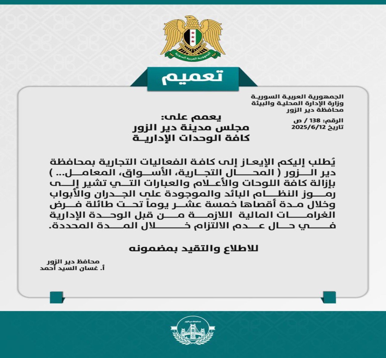 أصدرت محافظة دير الزور تعميماً إلى كافة الفعاليات التجارية يقضي بإزالة جميع رموز النظام البائد من لوحات وأعلام وعبارات والموجودة على الجدران والأبواب والواجهات، خلال مدة أقصاها خمسة عشر يوماً تحت طائلة فرض الغرامات المالية من قبل الوحدات الإدارية في حال عدم الالتزام.
