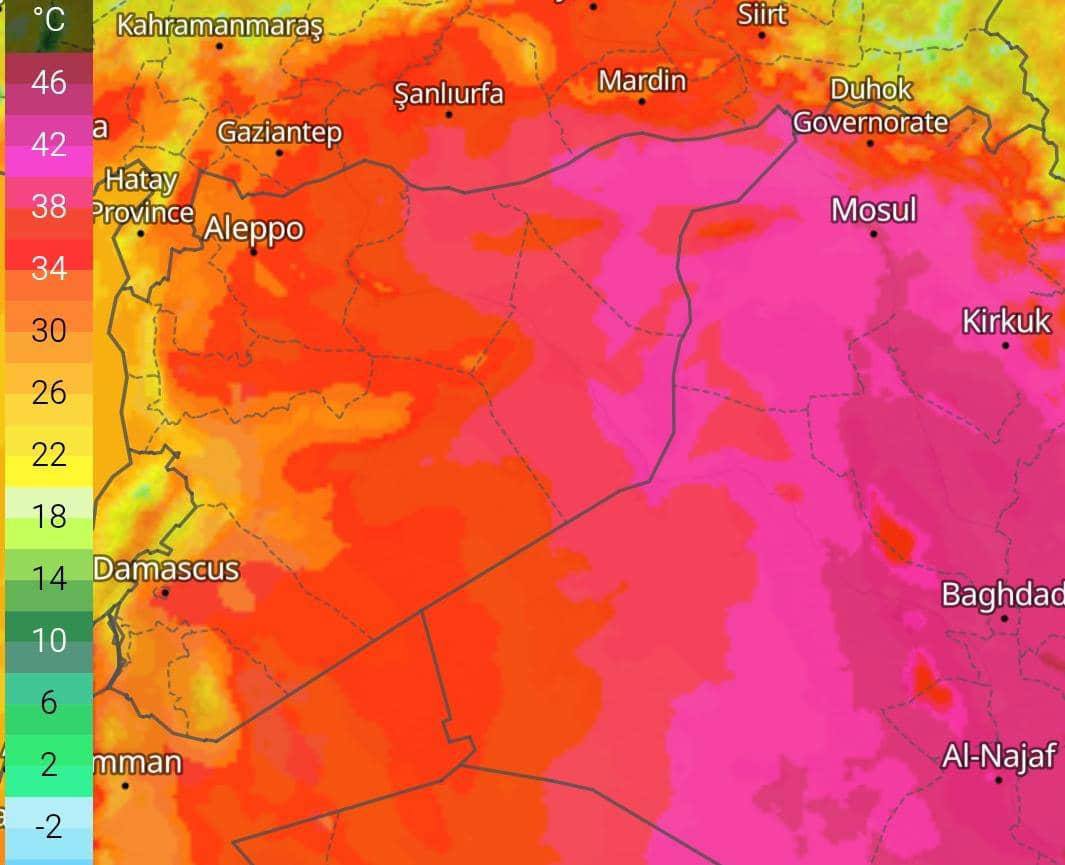 يكون طقس اليوم مشمساً حاراً ومستقراً على عموم المناطق السورية ويطرأ انخفاض طفيف على درجات الحرارة لتصبح أعلى من معدلاتها بنحو 1 إلى 3 درجات مئوية.