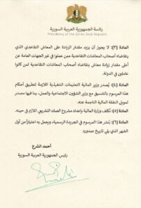 أصدر رئيس الجمهورية العربية السورية السيد أحمد الشرع المرسوم رقم 102 لعام 2025، القاضي بزيادة بنسبة 200% على الرواتب والأجور المقطوعة لكل من العاملين المدنيين والعسكريين في الوزارات والإدارات والمؤسسات العامة وشركات ومنشآت القطاع العام وسائر الوحدات الإدارية، وجهات القطاع العام وكذلك جهات القطاع المشترك التي لا تقل نسبة مساهمة الدولة فيها عن 50 بالمئة من رأسمالها