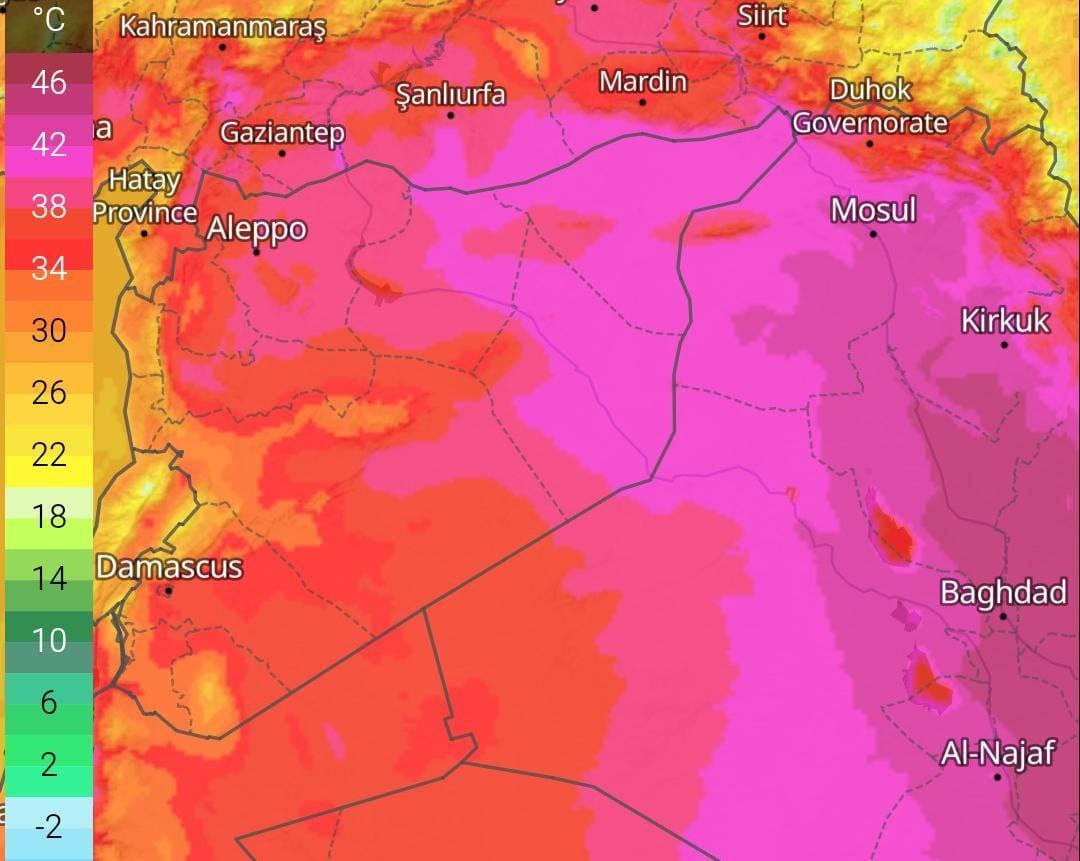 وبناءً على تحليل النماذج العددية الصادرة عن مكتب الإنذار المبكر للعوامل الجوية في الدفاع المدني السوري: يتحوّل طقس اليوم الأربعاء ليكون حاراً مشمساً مستقراً، مع بدء البلاد بالتأثر بموجة حرّ ضعيفة إلى متوسطة.