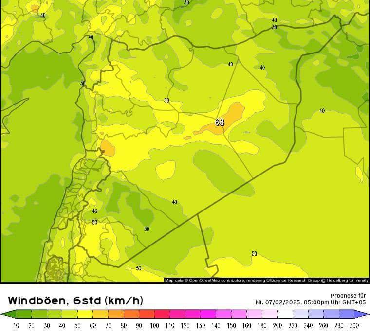تبلغ الرياح ذروة نشاطها غرب دير الزور مع هبّات تصل حتى 70 كم/ساعة مع ساعات مساء وليل الغد.