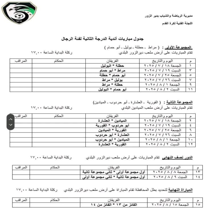 تنطلق مباريات دوري الدرجة الثانية في الثامن عشر من شهر تموز الحالي، يصعد الأول والثاني من كل مجموعة للدور الثاني (نصف النهائي)الذي يقام بطريقة خروج المغلوب على أن تقام مباريات الدور الثاني والمباراة النهائية على أرض الملعب البلدي بدير الزور لتحديد بطل المحافظة.