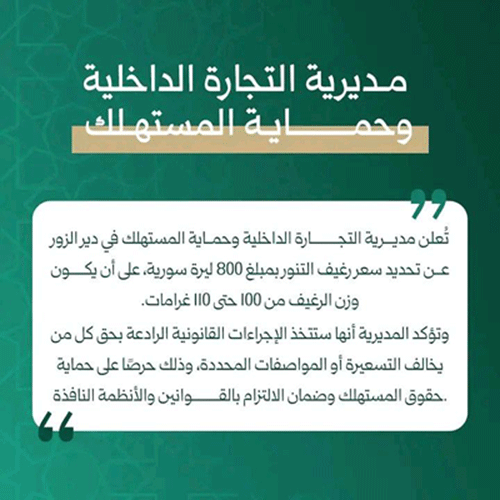أعلنت مديرية التجارة الداخلية وحماية المستهلك في دير الزور عن تحديد سعر رغيف خبز التنور بمبلغ 800 ليرة سورية، على أن يكون وزن الرغيف من 100 حتى 110 غرامات.