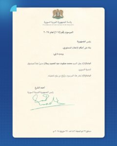 الرئيس الشرع يصدر مرسوماً بتعيين السيد محمد صفوت عبد الحميد رسلان مديراً عاماً لصندوق التنمية السوري رئيسيمحليات في 9 تموز , 2025 شارك FacebookTwitterWhatsAppTelegramFacebook Messenger أصدر السيد الرئيس أحمد الشرع المرسوم رقم (117) لعام 2025 القاضي بتعيين السيد محمد صفوت عبد الحميد رسلان مديراً عاماً لصندوق التنمية السوري.
