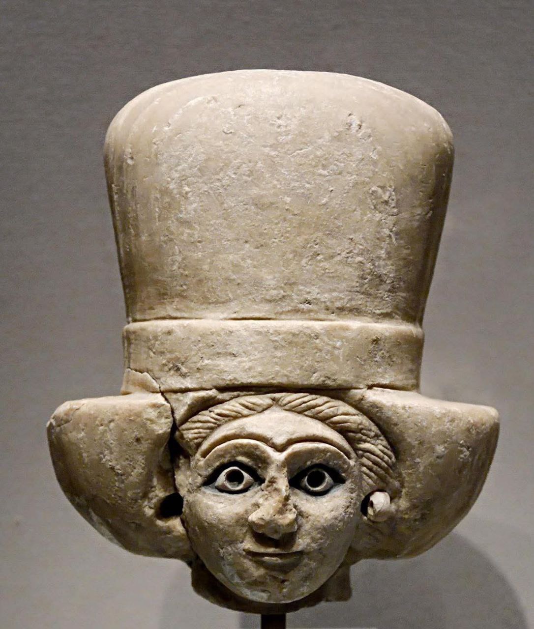أما النساء فكن واقفات والقدمان على نفس المستوى، أو جالسات واليدان مضمومتان إلى الصدر، ويلبسن رداء يستر الكتف الأيمن. وقد ارتدت الكاهنة طاقية تشبه البيريه (بولوس)، وقد نزلت العيون بالصدف أو بالمواد الأخرى النادرة.