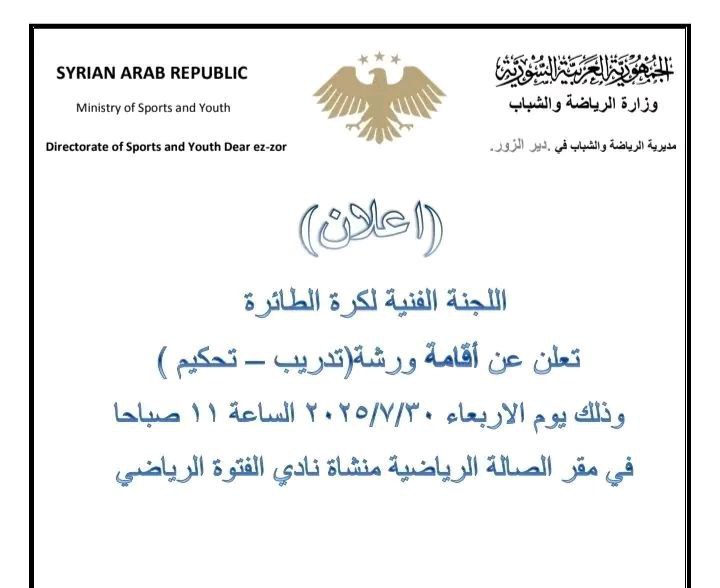 ورشة تدريب وتحكيم بالكرة الطائرة في دير الزور رياضة في 29 تموز , 2025 شارك FacebookTwitterWhatsAppTelegramFacebook Messenger مراسل الفرات ديرالزور تقييم اللجنة الفنية الفرعية لكرة الطائرة بديرالزور ورشة تدريب وتحكيم في لعبة كرة الطائرة وذلك يوم الاربعاء 30/7/2025 الساعة الحادية عشرة صباحا بمديرية الرياضة والشباب على أرض ملعب الصالة الرياضية في منشأة نادي الفتوة الرياضي