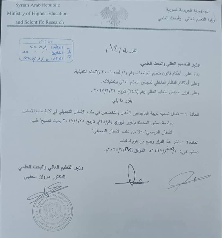 المادة 1- تُعدل تسمية درجة الماجستير التأهيل والتخصص في طب الأسنان التجميلي في كلية طب الأسنان بجامعة دمشق، المحدثة بالقرار الوزاري رقم /24/و تاريخ 25/4/2017، بحيث تصبح “طب الأسنان الترميمي” بدلاً من “طب الأسنان التجميلي”.