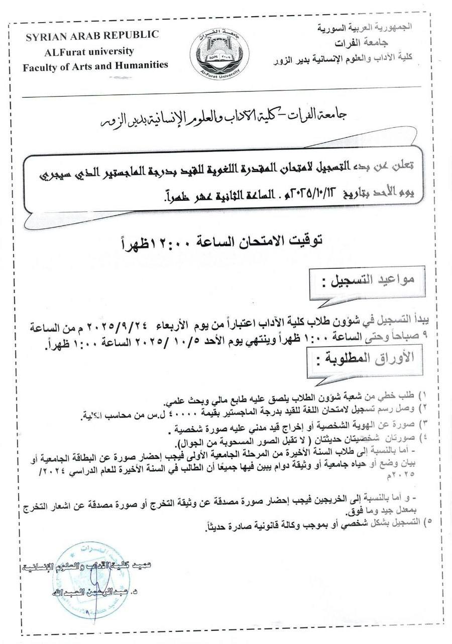 أعلنت كلية الآداب والعلوم الإنسانية في جامعة الفرات بدير الزور عن بدء التسجيل لامتحان المقدرة اللغوية للقيد بدرجة الماجستير الذي سيجري عند الساعة الثانية عشرة ظهراً من يوم الأحد ٢٠٢٥/١٠/١٢
