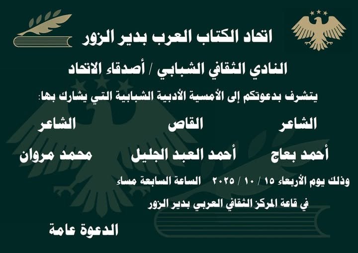 دعا النادي الشبابي في اتحاد الكتاب العرب بدير الزور لحضور أمسية ثقافية شبابية، يشارك بها كل من الشاعر أحمد بعاج، والقاص أحمد العبد الجليل، والشاعر محمد مروان، وذلك يوم الأربعاء القادم 15-10-2025 الساعة السابعة مساء في قاعة المركز الثقافي العربي بدير الزور.