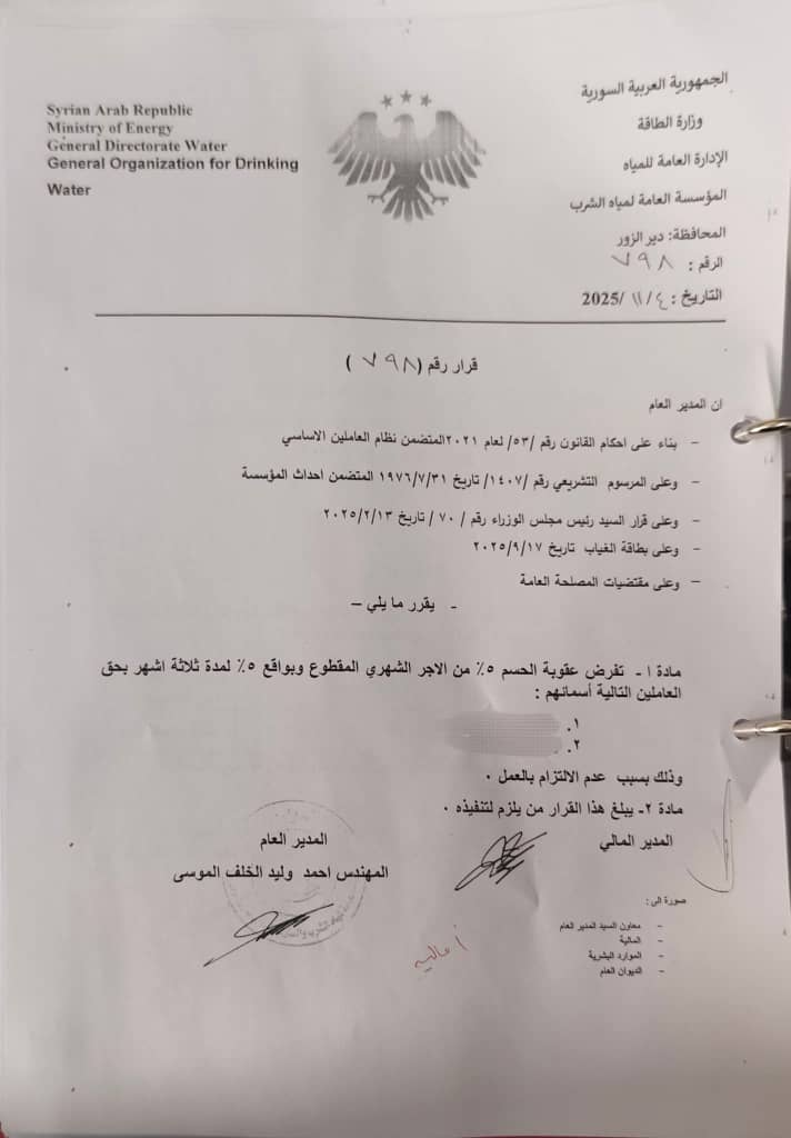 واستناداً إلى أحكام القانون رقم /53/ لعام 2021، الذي يتضمن نظام العاملين الأساسي، أصدر المدير العام قراراً يقضي بفرض عقوبة حسم 5% من الأجر الشهري المقطوع على الموظفين المدعوين (ز.م) و (ج.م) لمدة ثلاث أشهر، هذا القرار يأتي كتحذير صارم للجميع بأن التهاون في العمل لن يُقبل، وأن كل موظف يجب أن يتحمل مسؤولياته بشكل كامل، خاصة في مجالات حيوية مثل توفير مياه الشرب التي تمس حياة الناس بشكل مباشر.