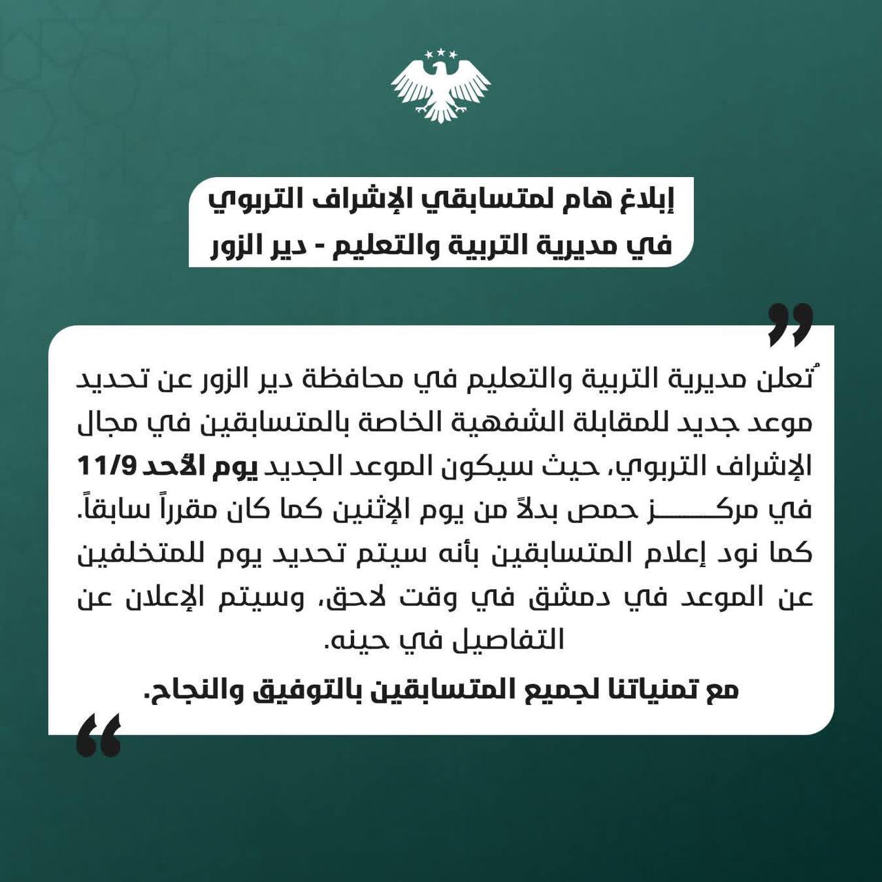حددت مديرية التربية والتعليم في دير الزور موعد جديد للمقابلة الشفهية الخاصة بالمتسابقين في مجال الإشراف التربوي وذلك يوم الأحد 9/11/2025 في مركز حمص، بدلاً من يوم الاثنين كما كان مقرراً سابقاً.
