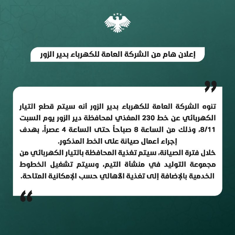 أعلنت الشركة العامة للكهرباء بدير الزور أنه سيتم قطع التيار الكهربائي عن خط 230 المغذي لمحافظة دير الزور اليوم السبت وذلك من الساعة 8 صباحاً حتى الساعة 4 عصراً، وذلك إجراء أعمال صيانة على الخط المذكور.