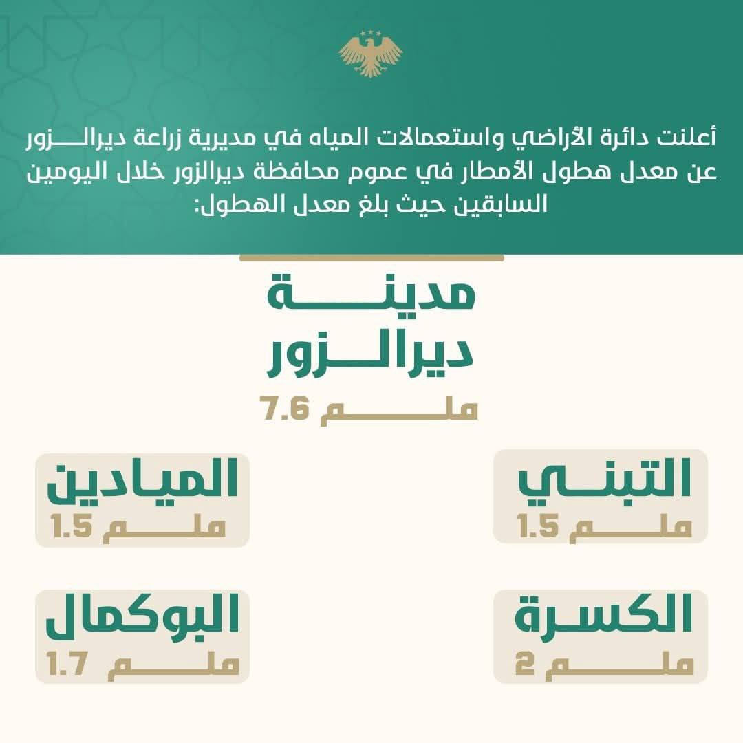 وذلك وفق ما أعلنت دائرة الأراضي واستعمالات المياه في مديرية زراعة دير الزور التي أوضحت أن معدل هطول الأمطار في عموم محافظة دير الزور خلال اليومين السابقين بلغ : في مدينة التبني ملم 1.5 وفي الكسرة ملم 2 وفي الميادين ملم 1.5 وفي البوكمال 1.7 مم.