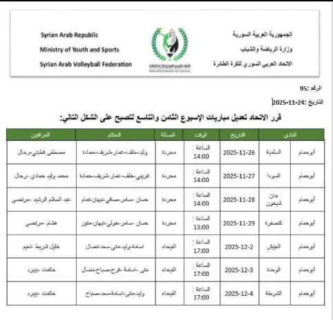 أولى محطات الفريق ستكون يوم الاربعاء حيث يواجه رجال نادي ابـو حــمــام لكرة الطائرة نادي سلمية في عقر داره على أرض ملعب صالة محردة في محافظة حماة في أول ظهور له في الدوري السوري الممتاز بكرة الطائرة، المباراة تقام الساعة الثانية عصرا بتوقيت دمشق ، على أن يلتقي نادي السودا يوم الخميس ،ثم يواجه كنصفرة يوم الجمعة ومن ثم يلاقي السبت خان شيخون بنفس الصالة والتوقيت ، ثم ينتقل إلى دمشق لمواجهة فرقها الجيش والوحدة والشرطة الساعة الخامسة مساء على أرض ملعب صالة الطائرة في مدينة الفيحاء الرياضية أيام الثلاثاء والأربعاء والخميس من بداية شهر كانون الأول القادم