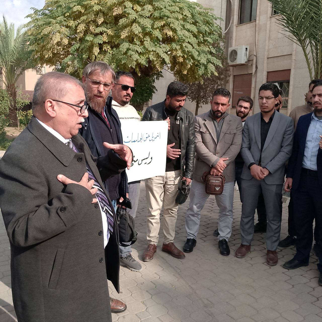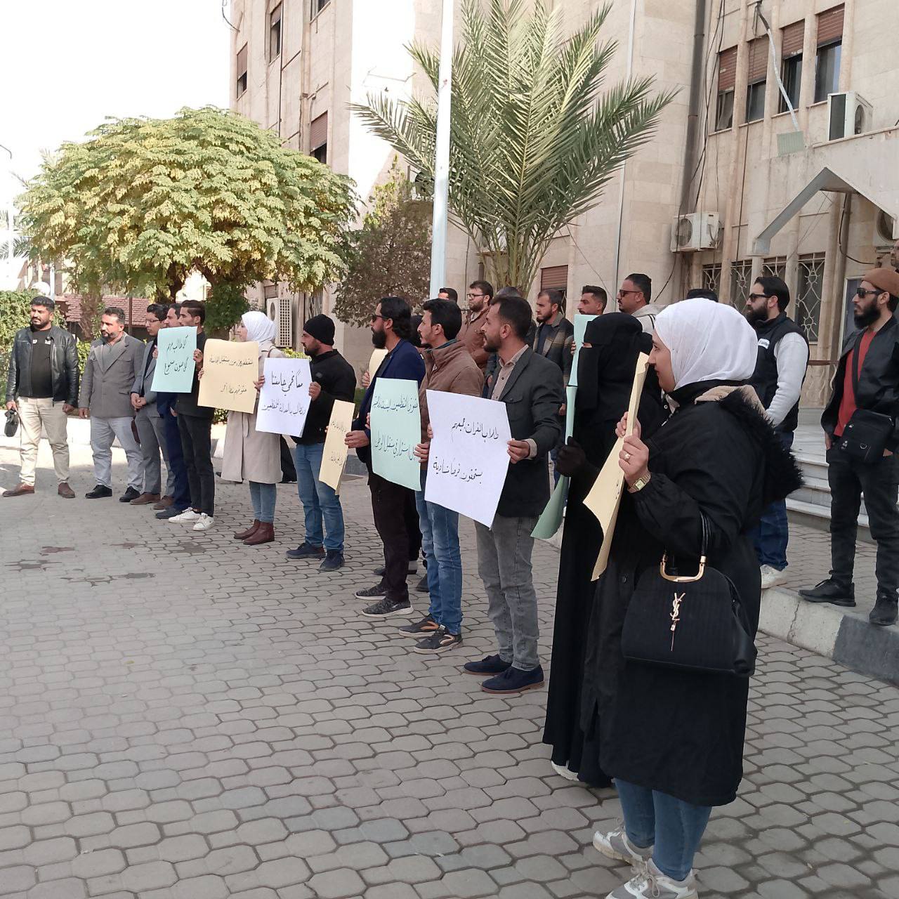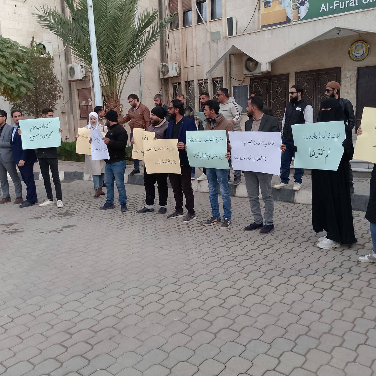 نفذ مجموعة من الطلاب والطالبات المنقطعين عن الدراسة وقفة احتجاجية في ساحة رئاسة جامعة الفرات بديرالزور وذلك بسبب المشاركة بالثورة وحملت اللوحات المرفوعة في الوقفة عبارات بأنهم جزء من مستقبل الجامعة وحقوقهم خط أحمر، وانهم يستحقون فرصا متساوية مع من تابع الدراسة، وضرورة المطالبة بالعدالة للطلاب المنقطعين، واهمية عودتهم للدراسة ومتابعة تحصيلهم العلمي وايجاد حلول عادلة والمساهمة في بناء المجتمع المدني وسورية الجديدة.