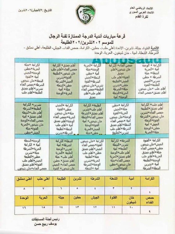 جرى في مقر اتحاد كرة القدم السوري (قبة الفيحاء)اليوم سحب قرعة دوري الدرجة الممتازة بكرة القدم ومن المقرر أن تنطلق منافسات الدوري السوري الممتاز لكرة القدم في الثامن عشر من الشهر الحالي وستكون مواجهات الجولة الاولى كالتالي: