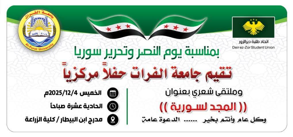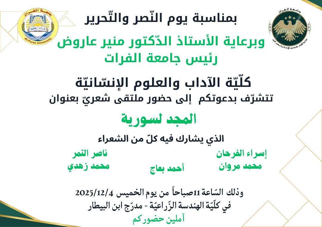 بمناسبة يوم النصر والتحرير.. ملتقى شعري تحت عنوان (المجد لسوريا) في آداب دير الزور ثقافة في 3 كانون أول , 2025 شارك FacebookTwitterWhatsAppTelegramFacebook Messenger تحت شعار “المجد لسوريا”، تنظم كلية الآداب والعلوم الإنسانية في جامعة الفرات ملتقى شعريًا، وذلك بمناسبة ذكرى يوم النصر والتحرير، في يوم الخميس ٤ كانون الأول ٢٠٢٥م، الساعة الحادية عشرة صباحًا، في مدرج ابن البيطار.