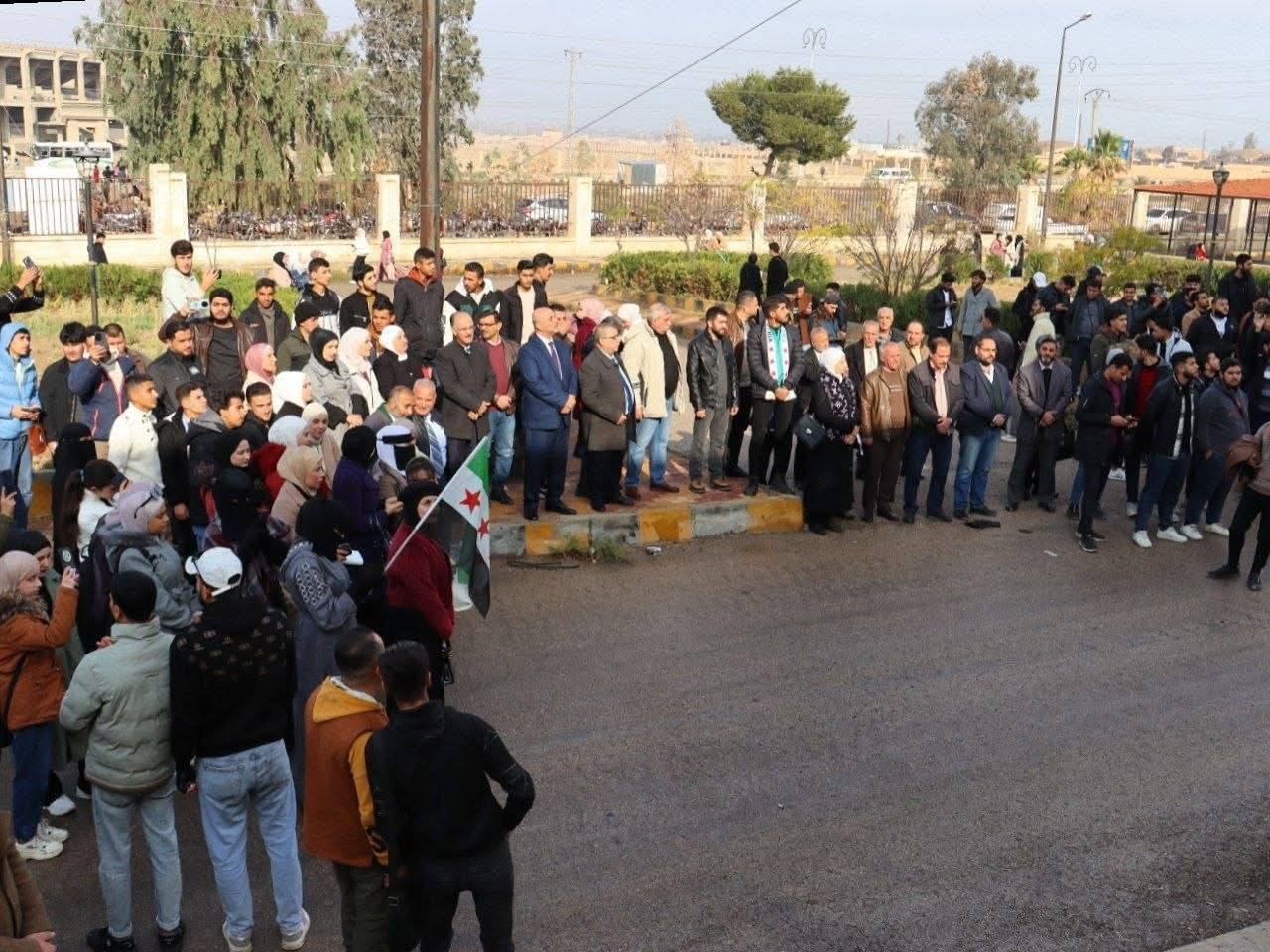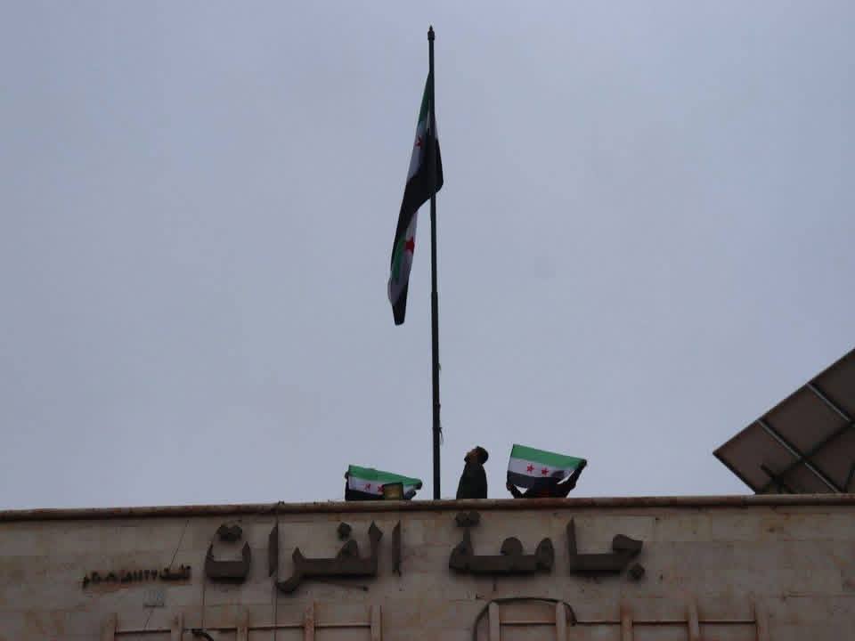 احتفاءً بعيد التحرير وانتصار الثورة السورية، وبحضور رئيس جامعة الفرات الدكتور “منير عاروض”، ونوابه وعمداء الكليات وحشد كبير من طلبة الكليات والمعاهد رفعت الأعلام السورية على مباني الجامعة بديرالزور تأكيداً على الفخر الوطني والاعتزاز بالتاريخ المجيد ،ونؤكد أن مستقبلنا نصنعه بإصرارنا و وحدتنا وأن جامعة الفرات ستظل منارة للعلم