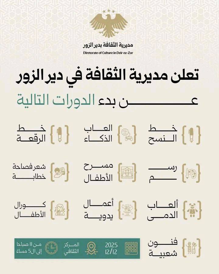 تعلن مديرية الثقافة في دير الزور عن بدء التسجيل في دورات بناء المهارات لدى الأطفال واليافعين في الدورات التالية : دورة خط النسخ ، ألعاب الذكاء ، خط الرقعة ، دورة الرسم ،