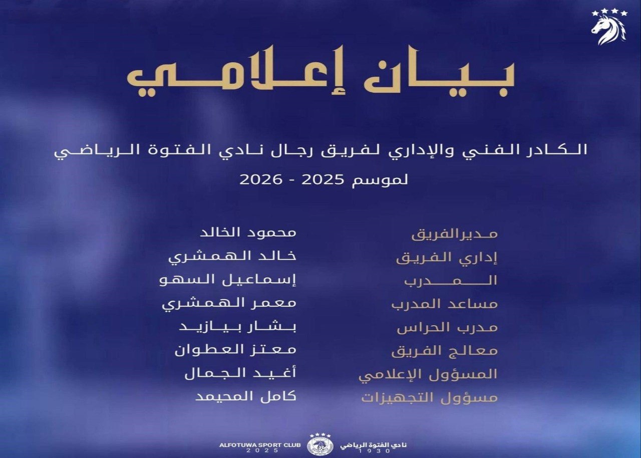 أصدرت إدارة نادي الفتوة الرياضي بيانا إعلاميا أعلنت خلاله عن تشكيل الكادر الفني والإداري لفريق رجال اانادي بكرة القدم
