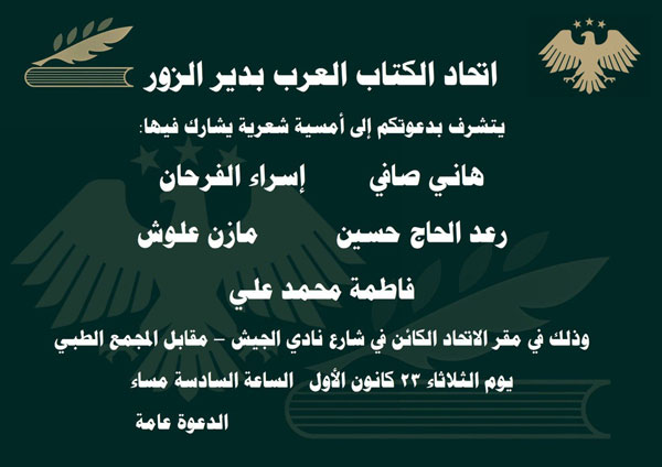 أمسية شعرية في اتحاد كتاب دير الزور ثقافة في 22 كانون أول , 2025 شارك FacebookTwitterWhatsAppTelegramFacebook Messenger يقيم فرع اتحاد الكتاب بدير الزور اليوم أمسية شعرية يشارك فيها كل من: هاني صافي، إسراء الفرحان، رعد الحاج حسين، مازن علوش، فاطمة محمد علي وذلك في مقر الاتحاد الكائن في شارع نادي الجيش – مقابل المجمع الطبي في الساعة 6:00 مساء والدعوة عامة