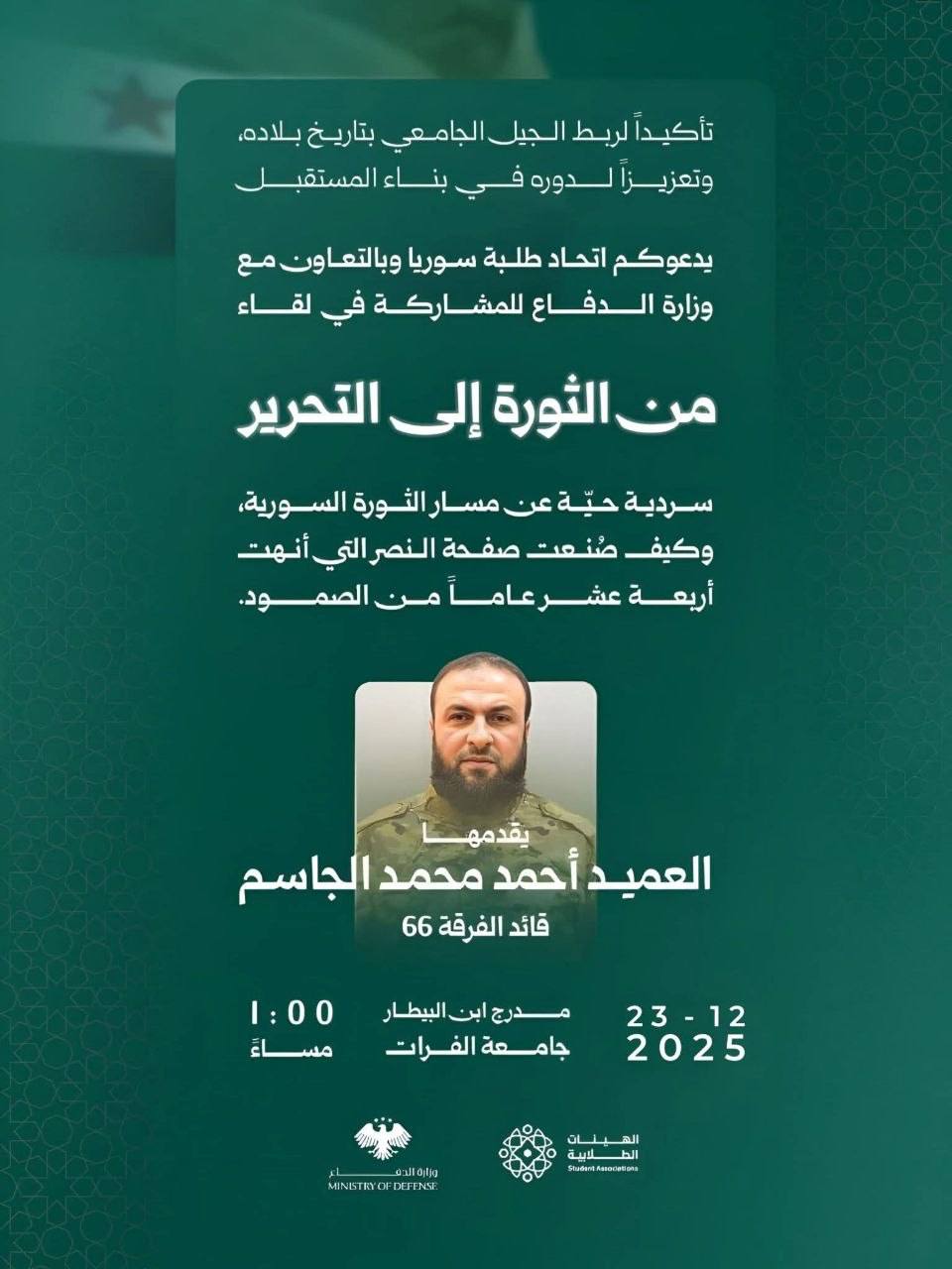 تأكيدا لربط الجيل الجامعي بتاريخ بلاده، وتعزيزا لدوره في بناء المستقبل، يقيم اتحاد طلبة دير الزور بالتعاون مع وزارة الدفاع للمشاركة لقاء بعنوان ” من الثورة إلى التحرير”