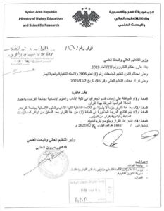 بناء على قانون تنظيم الجامعات السورية رقم /6/ لعام 2006 ولائحتة التنفيذية وتعديلاتهما ، وعلى قرار مجلس التعليم العالي رقم 91 تاريخ 2/11/2025 يقرر مايلي :
