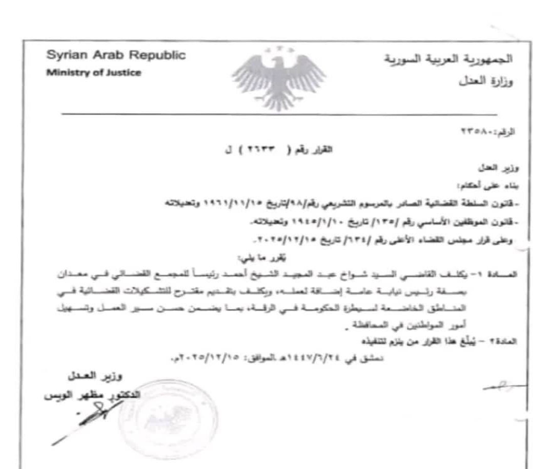 أصدر وزير العدل الدكتور مظهر الويس القرار رقم (2633/ل) المتضمن تكليف القاضي شواخ عبد المجيد الشيخ أحمد رئيساً للمجمع القضائي في معدان بصفة رئيس نيابة عامة إضافة لعمله، ويأتي هذا القرار في إطار تعزيز تنظيم العمل القضائي وتحسين الأداء في المرافق العدلية.