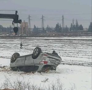 من جهة أخرى، وعلى طريق المطار في مدينة القامشلي، تسببت الظروف الجليدية وانخفاض درجات الحرارة (الصقيع) في انقلاب سيارة أخرى، حيث أُصيب السائق وتم نقله فوراً لتلقي العلاج المناسب، كما تسبب الحادث في خسائر مادية فادحة.
