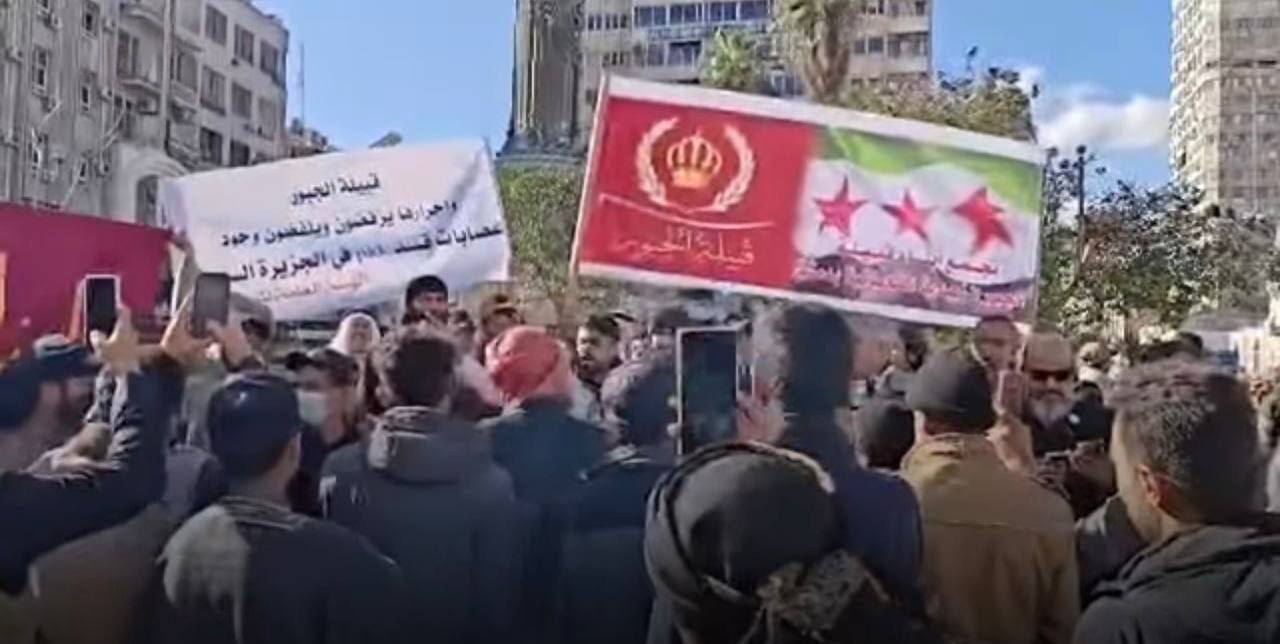 نظم أهالي المنطقة الشرقية والجزيرة وقفة احتجاجية في ساحة المرجة وسط العاصمة دمشق، مطالبين بإنهاء سيطرة “قسد” على تلك المنطقة ورفض شروط الاندماج في الجيش التي تطرحها قسد ككتلة واحدة.
