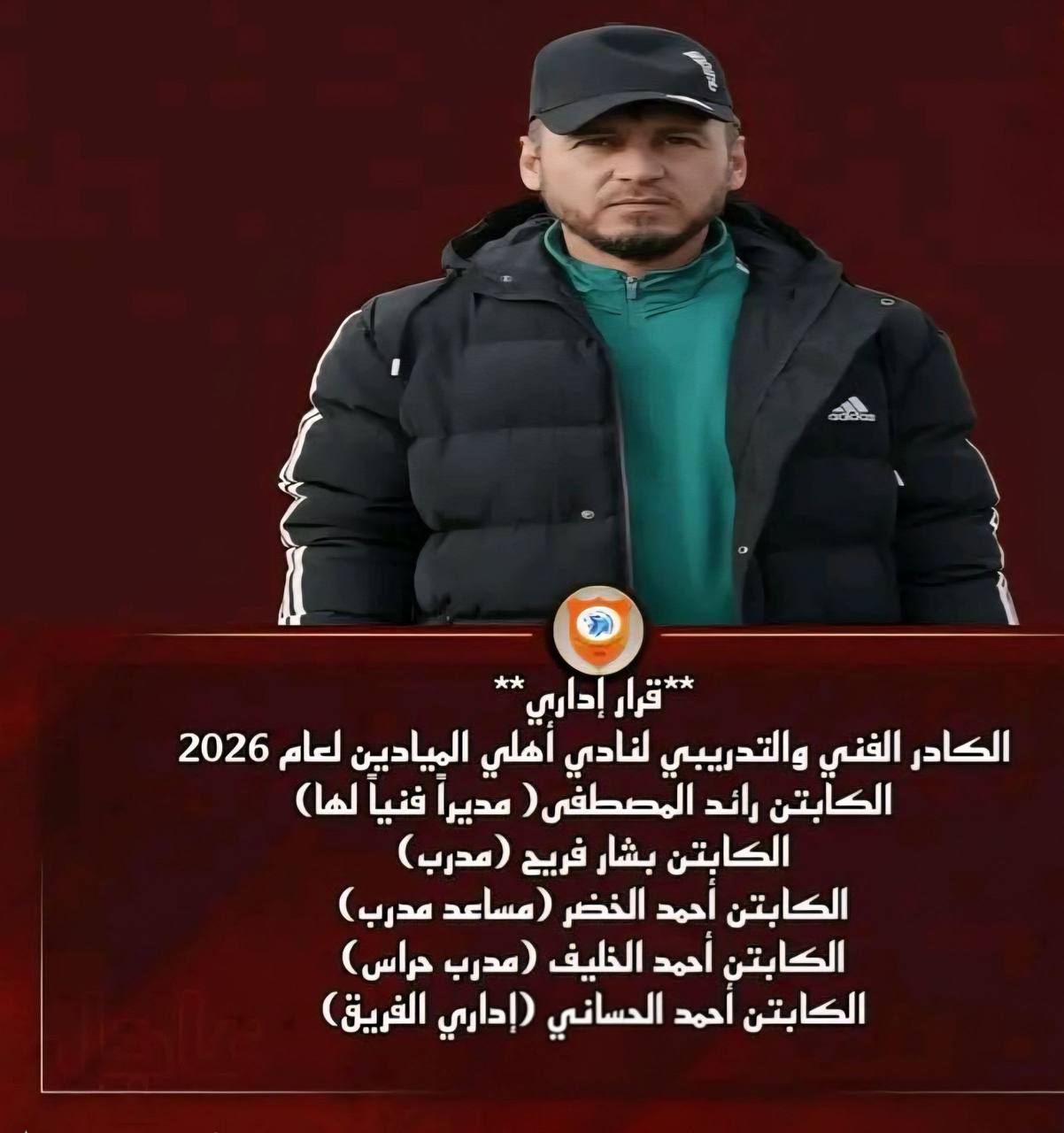 على خلفية استقالة الكادر الفني والتدريبي لرجال أهلي الميادين قبل عدة أيام، قررت إدارة النادي بعد اجتماعها اليوم تسمية الكادر الفني والتدريبي لفريق الرجال للموسم الكروي الجديد 2026 – 2027 والذي تكون من:
