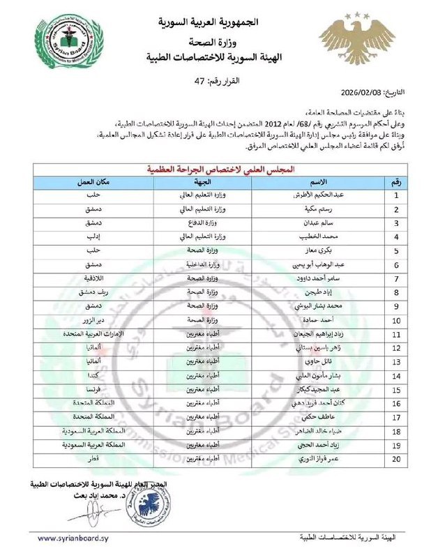 أصدر المدير العام للهيئة السورية للاختصاصات الطبية، الدكتور محمد إياد بعث، قائمة المجلس العلمي لاختصاص الجراحة العظمية في وزارة الصحة السورية، وذلك بعد إعادة تشكيل المجالس العلمية.