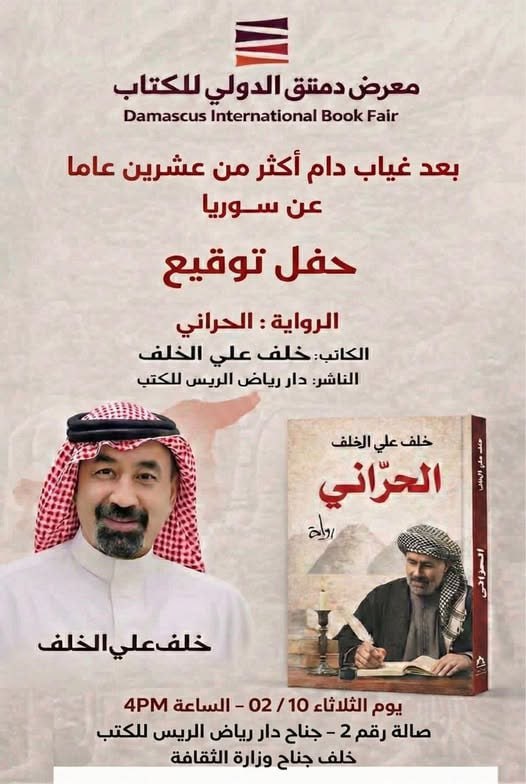 يوقع اليوم الثلاثاء 10-2-2026 الكاتب الرقي خلف علي الخلف روايته “الحراني” وذلك في صالة دار الريس خلف جناح وزارة الثقافة الساعة الرابعة مساء.