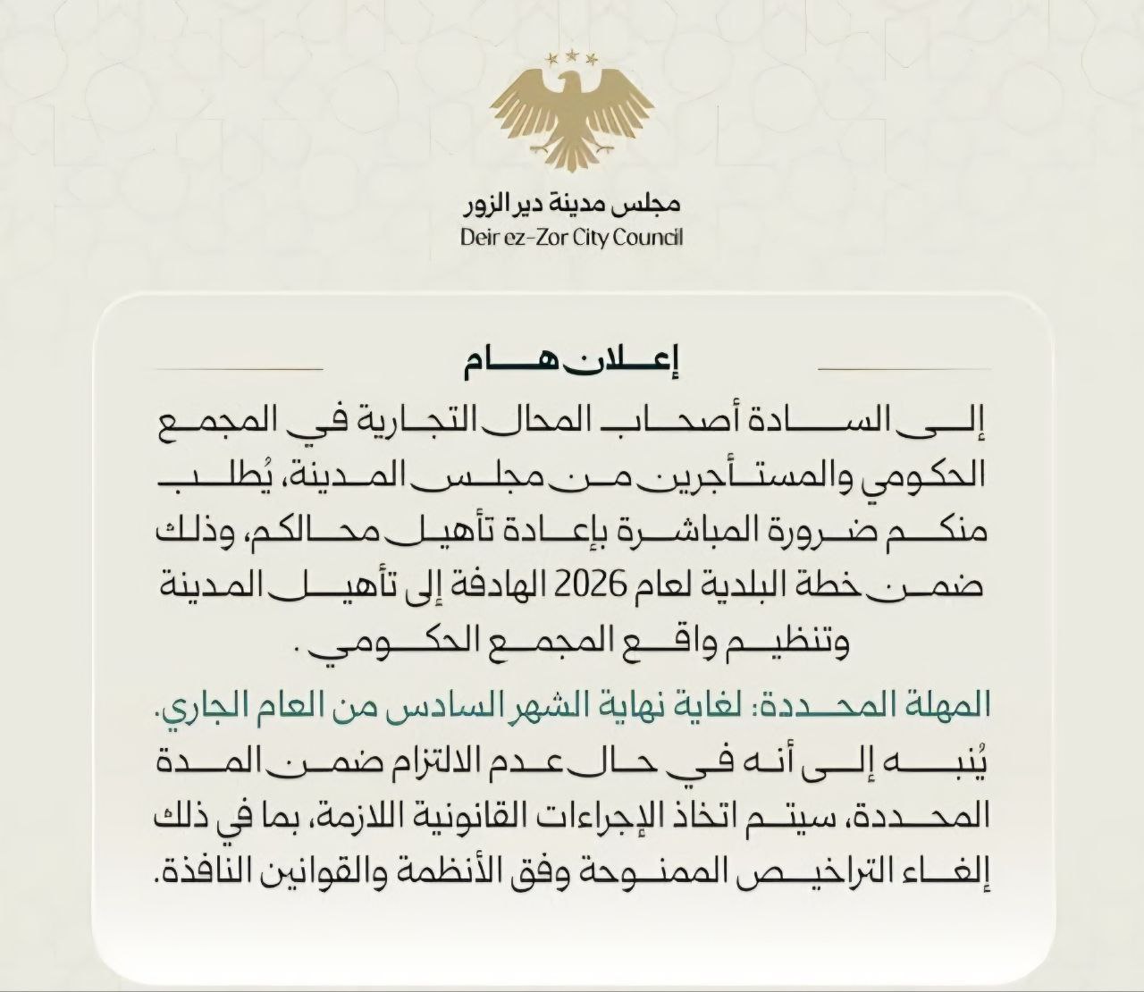 أصدر مجلس مدينة دير الزور إعلاناً عاجلاً موجهاً إلى أصحاب المحال التجارية والمستأجرين في المجمع الحكومي، مطالباً إياهم بالبدء الفوري بأعمال إعادة التأهيل والترميم لممتلكاتهم.