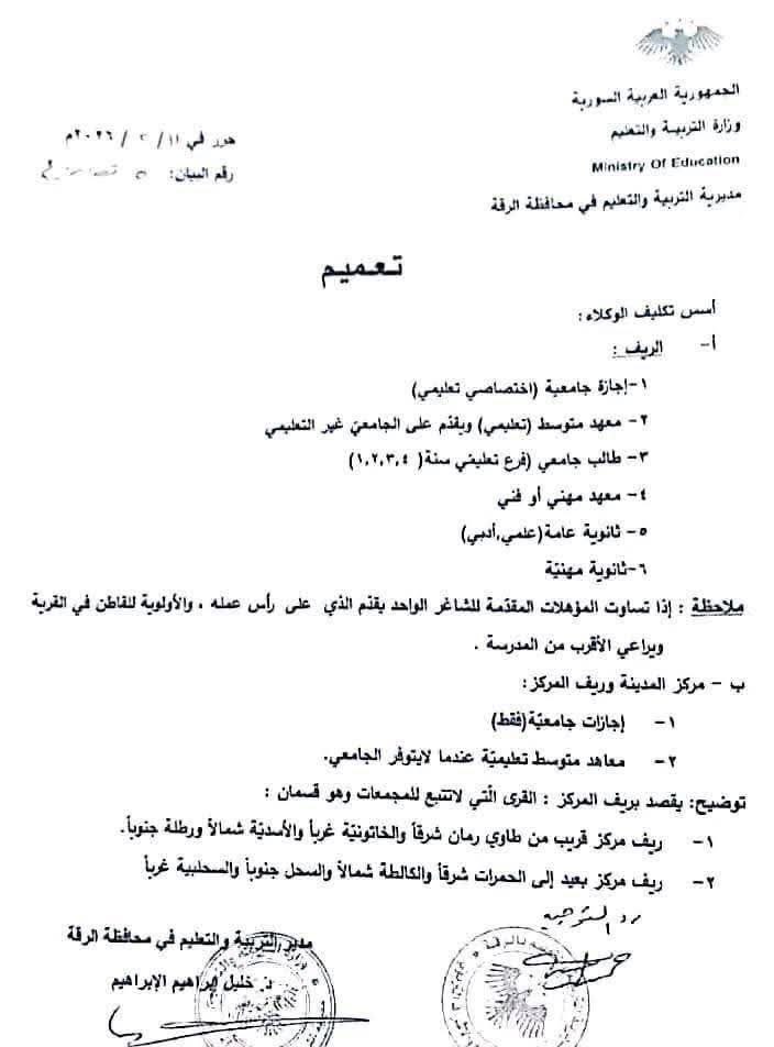 أصدرت مديرية التربية والتعليم في محافظة الرقة تعميماً جديداً حدّدت فيه الأسس والمعايير المعتمدة لتكليف المعلمين الوكلاء، بهدف سد الشواغر وضمان استقرار العملية التعليمية في مدارس المحافظة، وذلك وفق آلية مختلفة بين قطاعي الريف ومركز المدينة وريفه القريب.