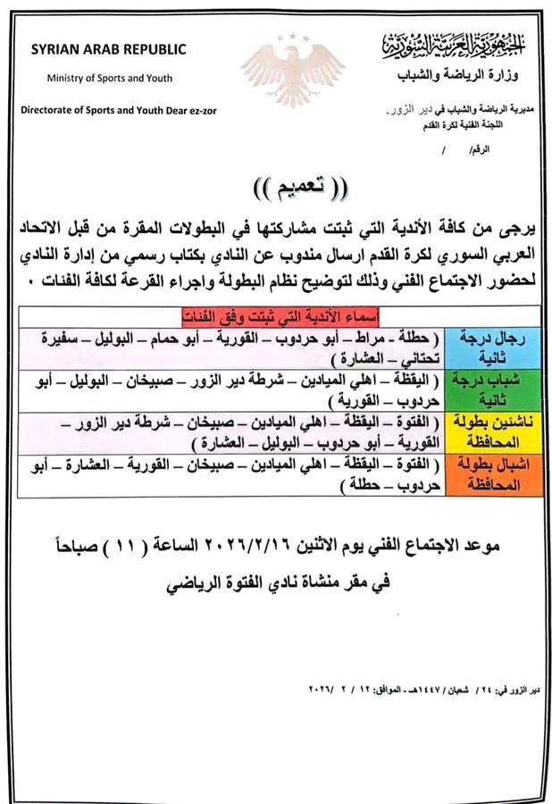 دعت مديرية الرياضة والشباب في دير الزور، جميع الأندية التي ثبّتت مشاركتها في البطولات المعتمدة من الاتحاد العربي السوري لكرة القدم وهي دوري الدرجة الثانية للرجال والشباب ودوري المحافظة للاشبال والناشئين إلى إرسال مندوب عنها لحضور الاجتماع الفني المخصص لشرح نظام البطولة وإجراء القرعة لجميع الفئات، وذلك يوم الاثنين الموافق 16 شباط في صالة نادي الفتوة عند الساعة 11:00 صباحاً.