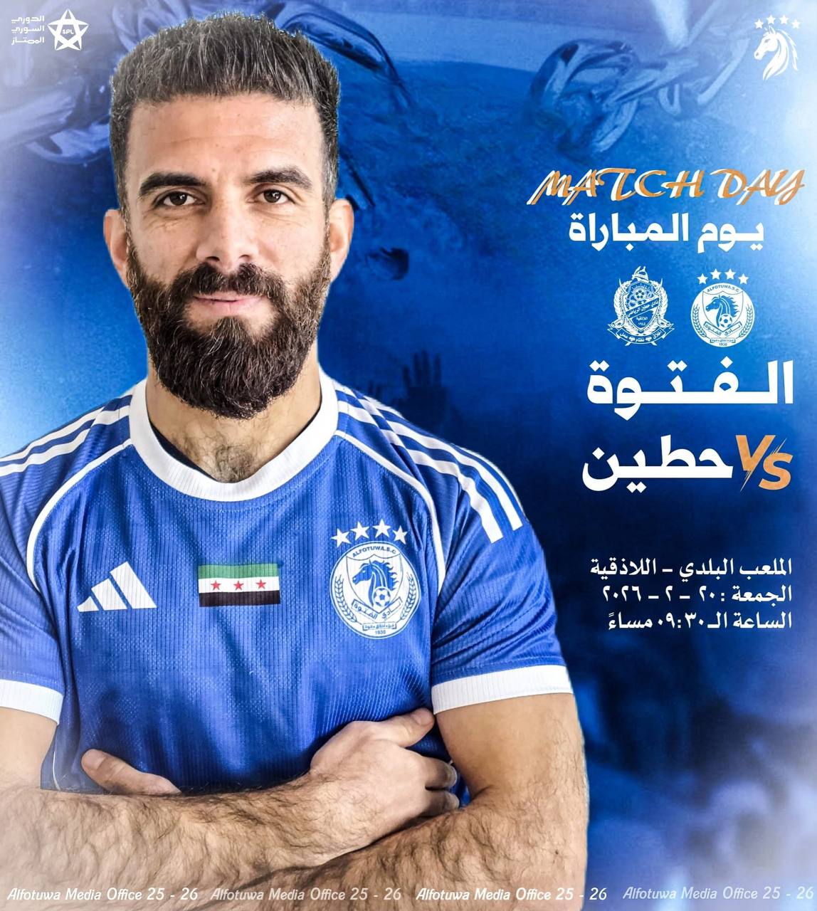 يشهد الدوري السوري الممتاز 2025-2026 اليوم الجمعة مباراة هامة بين فريقي الفتوة و حطين في إطار الجولة التاسعة.