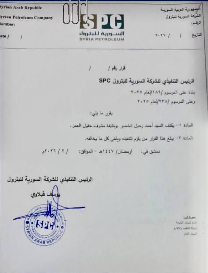 تعيين أحمد رحيل الخضر مشرفاً لحقول العمر في الشركة السورية للنفط عين الفرات في 20 شباط , 2026 شارك FacebookTwitterWhatsAppTelegramFacebook Messenger أصدر الرئيس التنفيذي للشركة السورية للنفط (SPC) يوسف قبلاوي، قراراً إدارياً بتعيين السيد أحمد رحيل الخضر في منصب “مشرف حقول العمر”